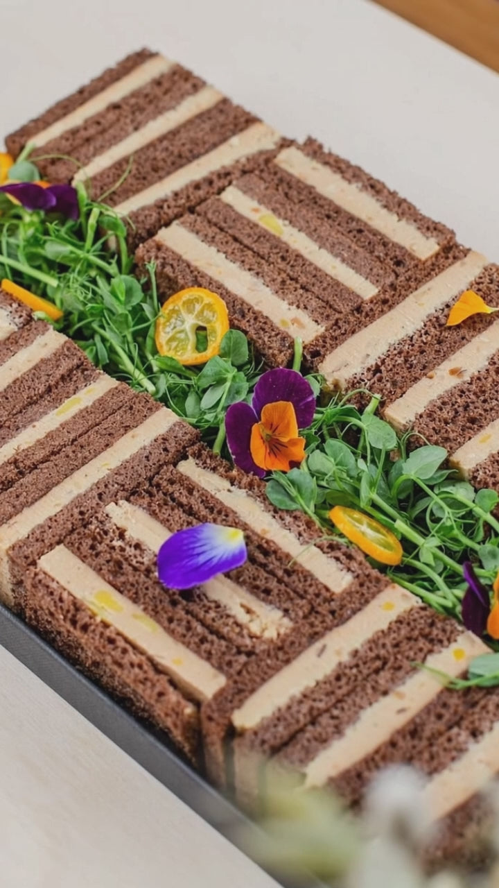 Un finger raffiné et audacieux : découvrez le foie gras mariné au cognac sublimé par un pain au grué de cacao, relevé d’un confit de figues, agrémenté du croquant des noisettes et décoré de pousses de petit pois et fleurs de pensées.